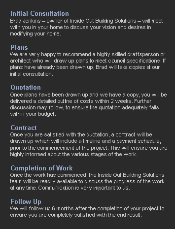 | Inside Out Building Solutions PO Box 601, Jannali 2226 Brad Jenkins 0430 319 440 Naomi Jenkins 0409 364 571 - © 2010 Site by Jeremy | ||||||||||||||